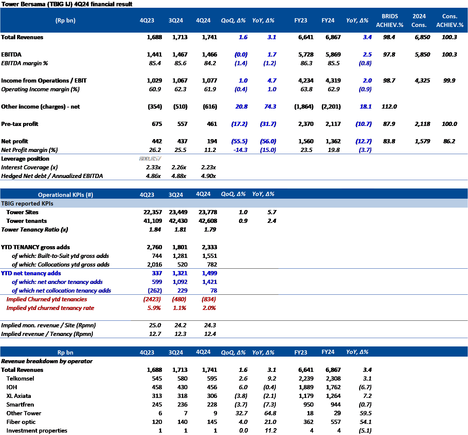 - 4Q24 Earnings: TBIG posted net profit of Rp194bn (-55.5% qoq, -56.0% yoy), missing estimates despite resilient topline and operating performance.